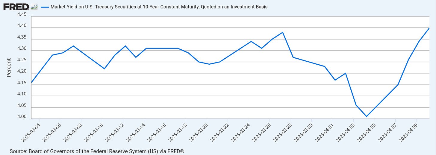 As laid out in my earlier analysis, the first aim of the tariffs in my estimation was a cheaper refinance of the treasury. Spook the global markets, let uncertainty spike, and watch the flight to safety rush into Treasury bonds. Yields sag, the greenback soars, and Uncle Sam locks in more favorable borrowing rates. That is precisely what I believe the White House hoped to replicate on April 2—except the script veered off in an unsettling direction.