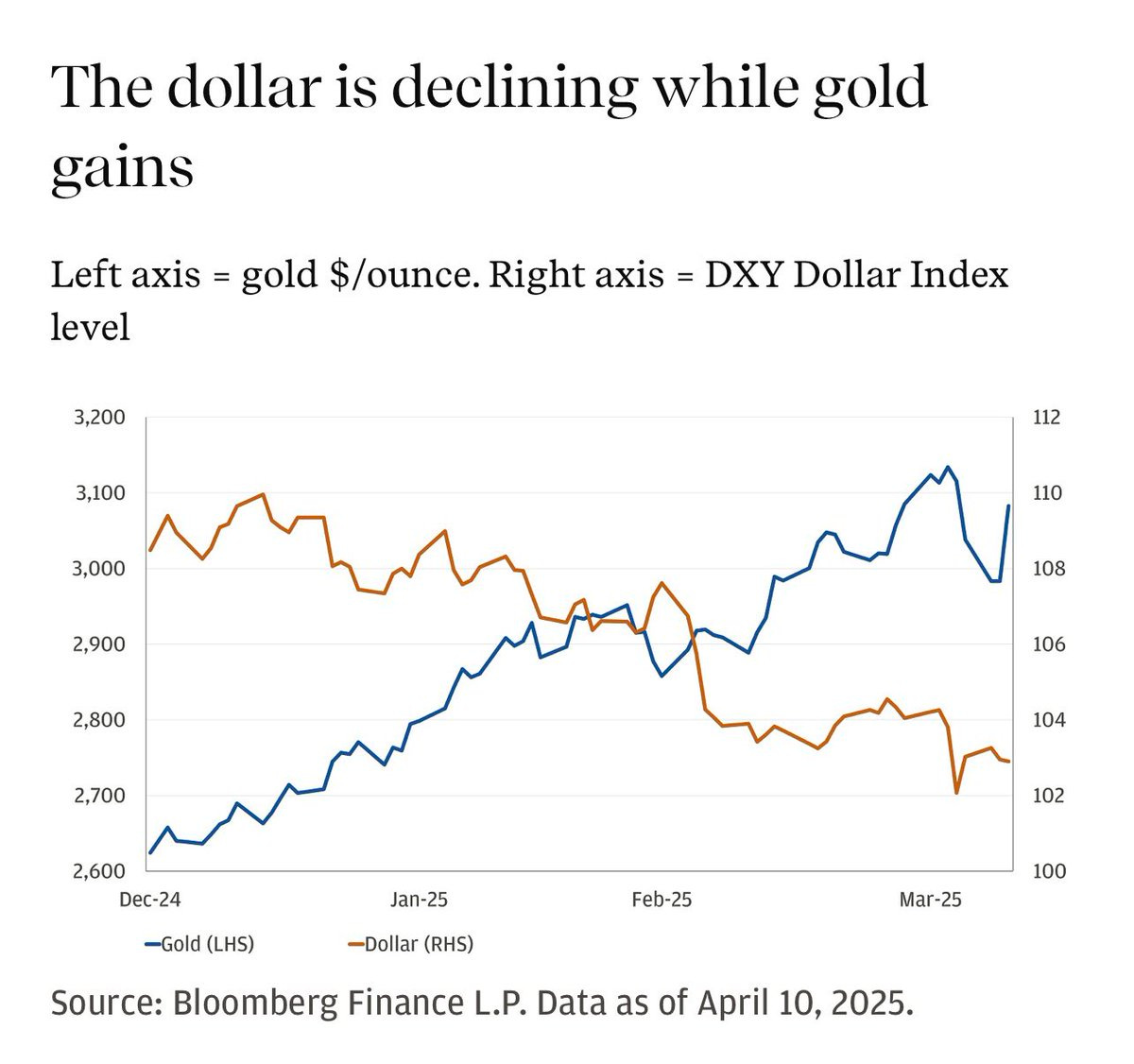 Yet even as bond demand stabilized, another measure of American power was blinking warnings. The dollar, that emblem of American might, was weakening rather than strengthening. The Dollar Index (DXY), sitting at 103.81 on April 2, had slid to 99.57 by April 13. At the same time, gold surged to around $3,244 an ounce, while the Euro, Swiss Franc, and Yen also gained ground.